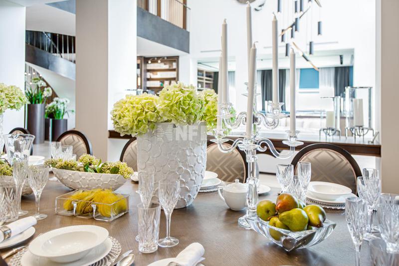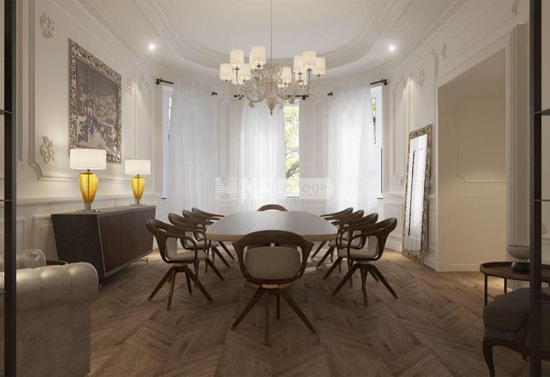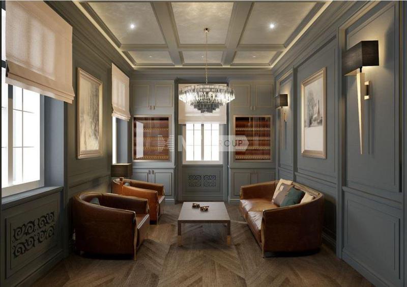 На первом этаже вас встречает элегантный холл с гардеробной, изысканный каминный зал, совмещенный со столовой, а также две кухни: хозяйская и профессиональная.